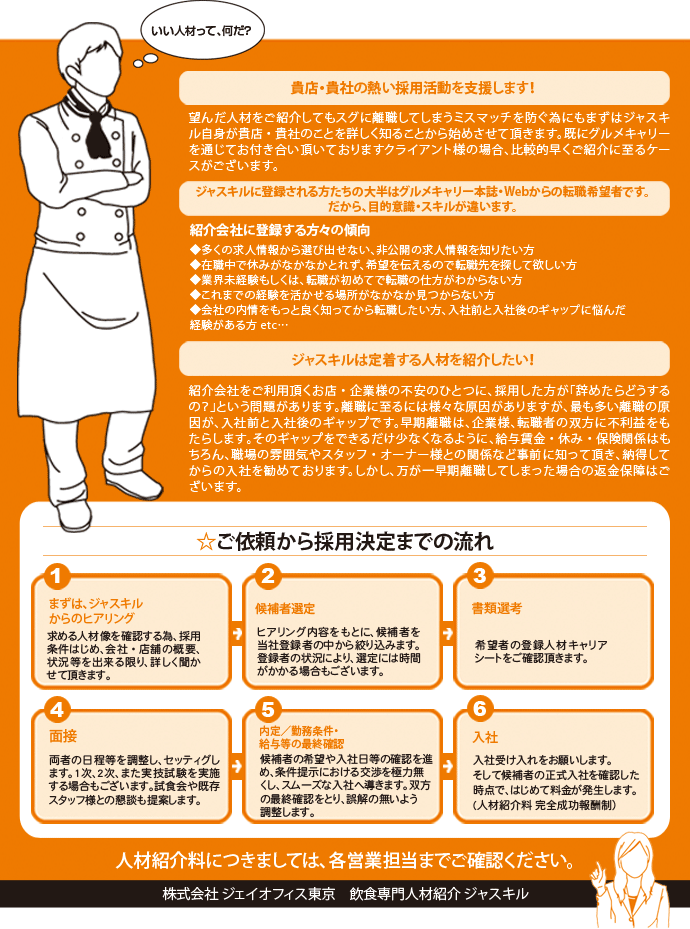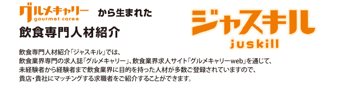 飲食転職・フード求人の業界専門情報サイト「ジャスキル」。正社員・アルバイト・パート・派遣・人材紹介のお仕事情報満載!